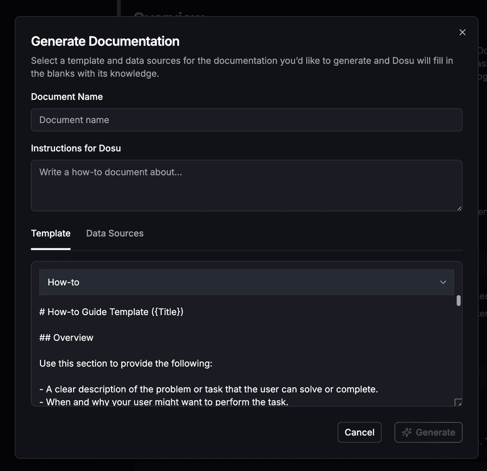 Now in the Dosu app, you'll see a new documents tab—which allows you to generate high quality markdown documents in a matter of minutes. Just give Dosu instructions and a template—such as a how-to guide, installation guide, README, or some other template you dream up—and Dosu will do the hard work to fill in the blanks.