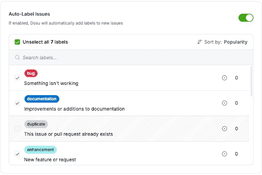 - Install Dosu, enable Auto-Labeling, and choose our labels.